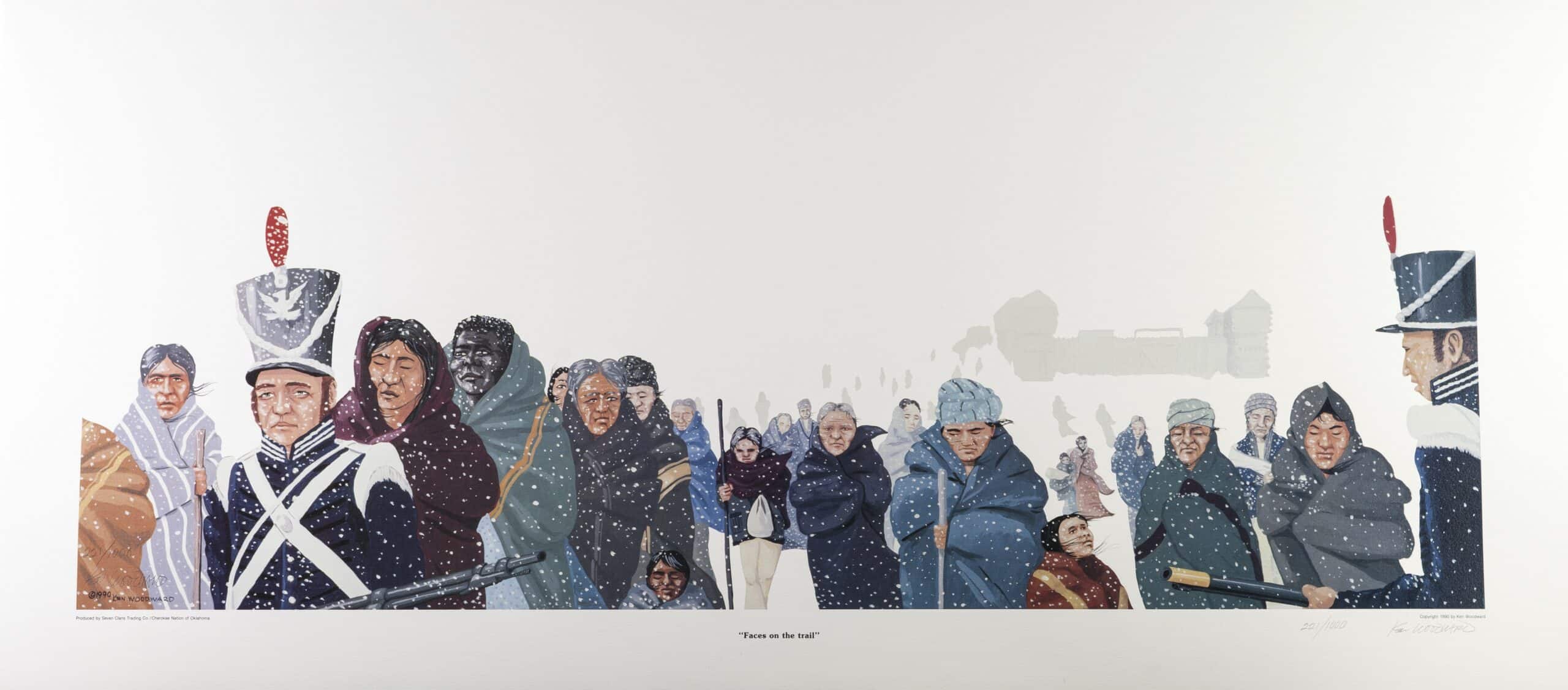 Faces on the Trail$75.00 Faces on the Trail is Ken Woodward’s haunting portrayal of the infamous Trail of Tears. This limited-edition print was produced by the Cherokee Nation of Oklahoma. Faces on the Trail quantity Add to cart Category: Ken Woodward Additional information Additional information Artist Ken Woodward Media Signed Unframed Print 221/1000 Size 16 x 36 Tribe Cherokee descent Related Products artistIndian Man and Teepee $250.00 Add to cart artist1987 Red Earth Festival Poster $50.00 Add to cart artistWho Will Sing for the Bird Clan $50.00 Add to cart Previous - Next